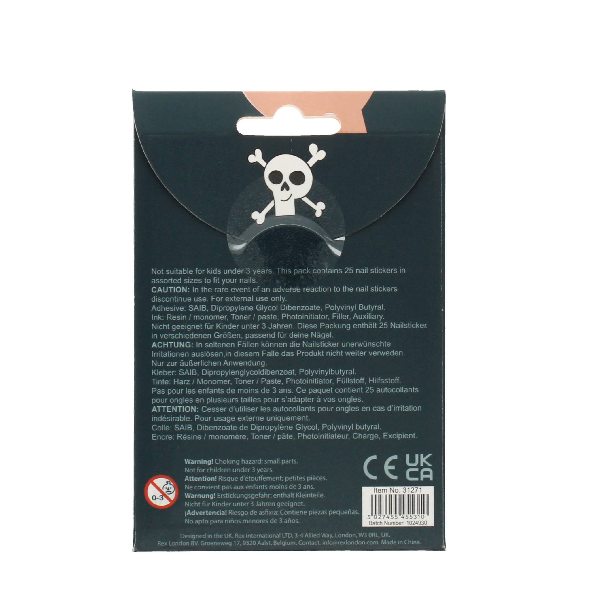 A pack of 25 scary nail stickers, each featuring a ghoulish face, skull and crossbones, spider, ghost, or bat. The perfect accessories for children's Halloween costumes!