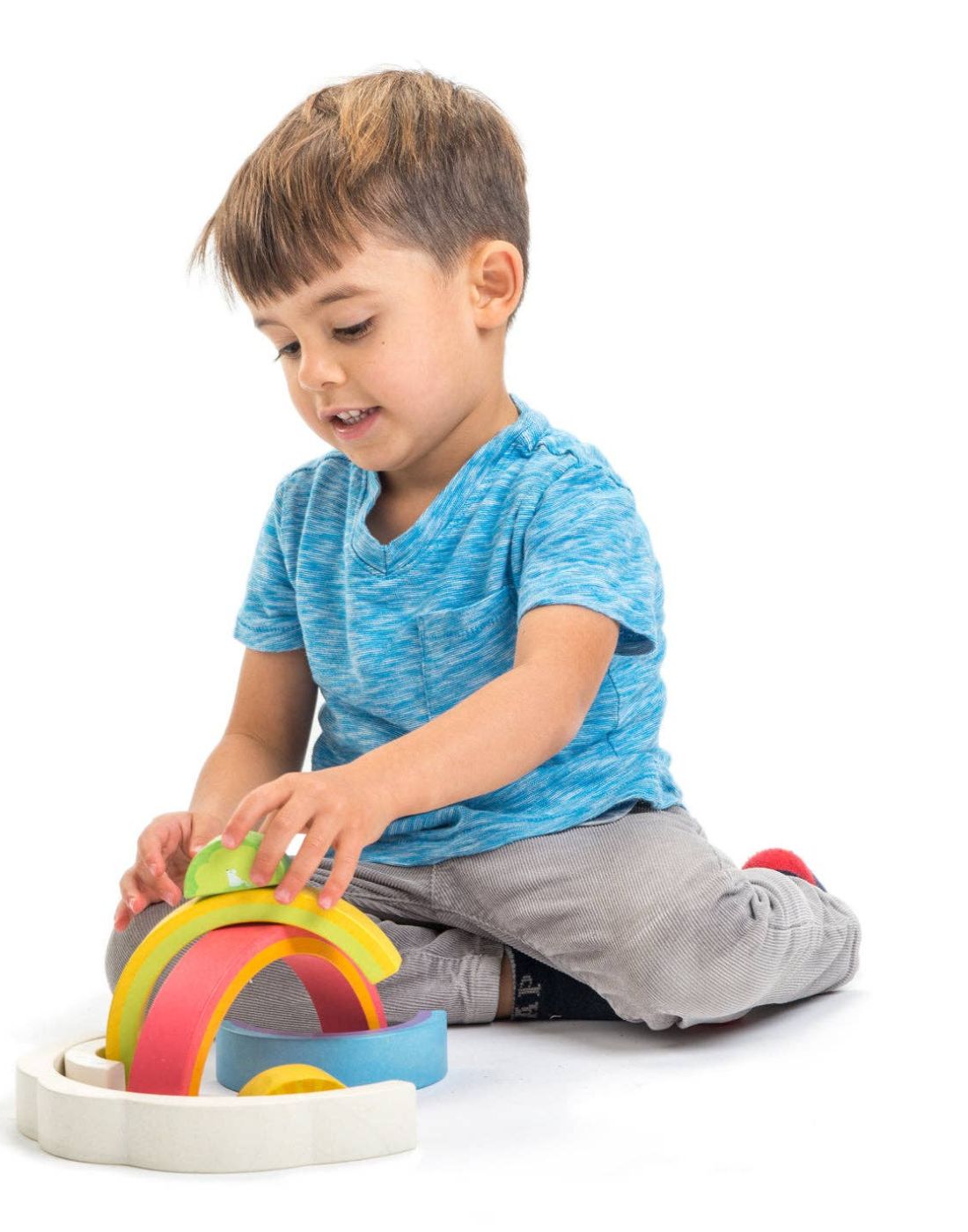Rainbow Tunnel toy by Tender Leaf Toys A 7 piece wooden tunnel puzzle toy for kids, that stacks together like a real rainbow.