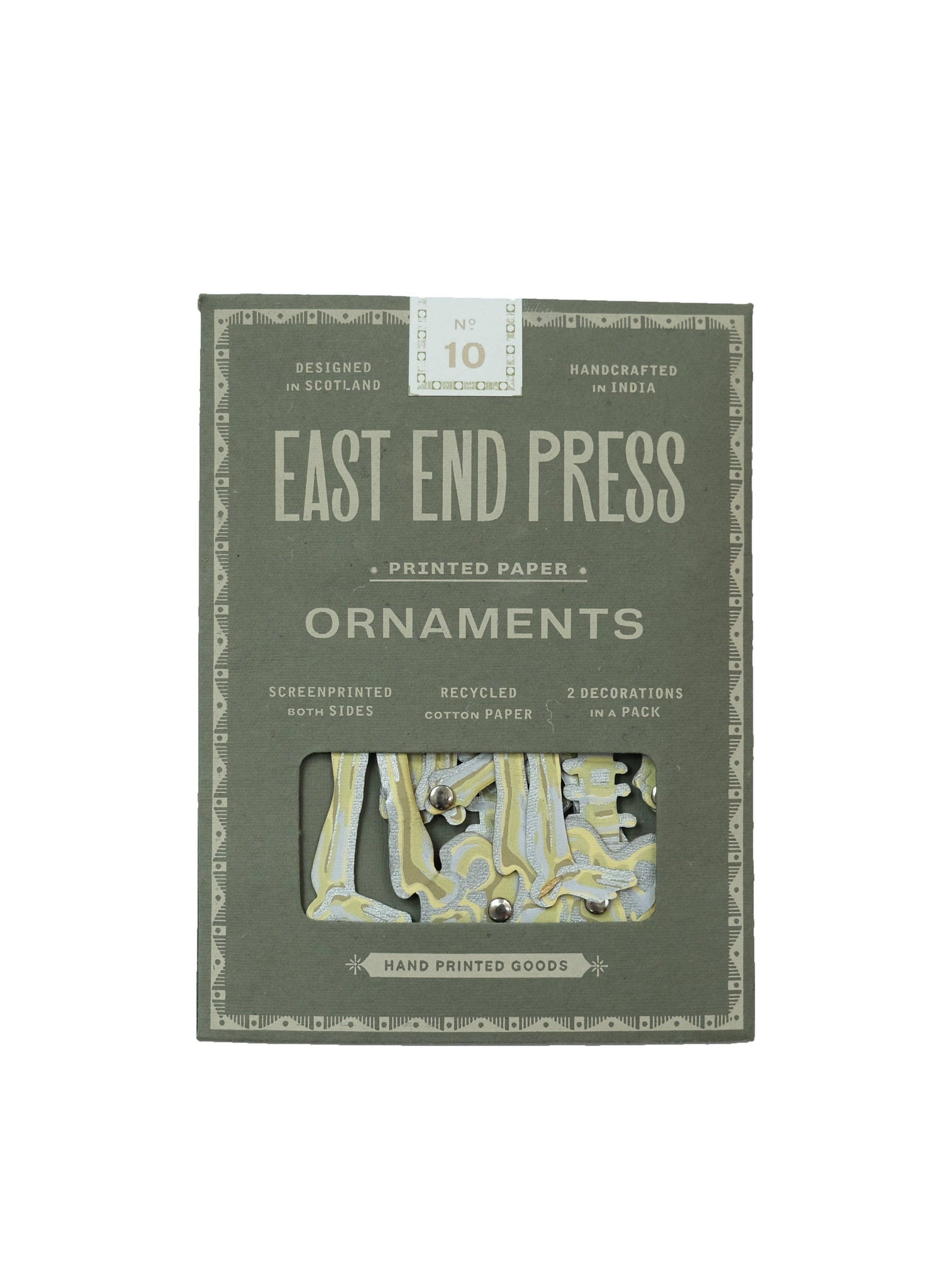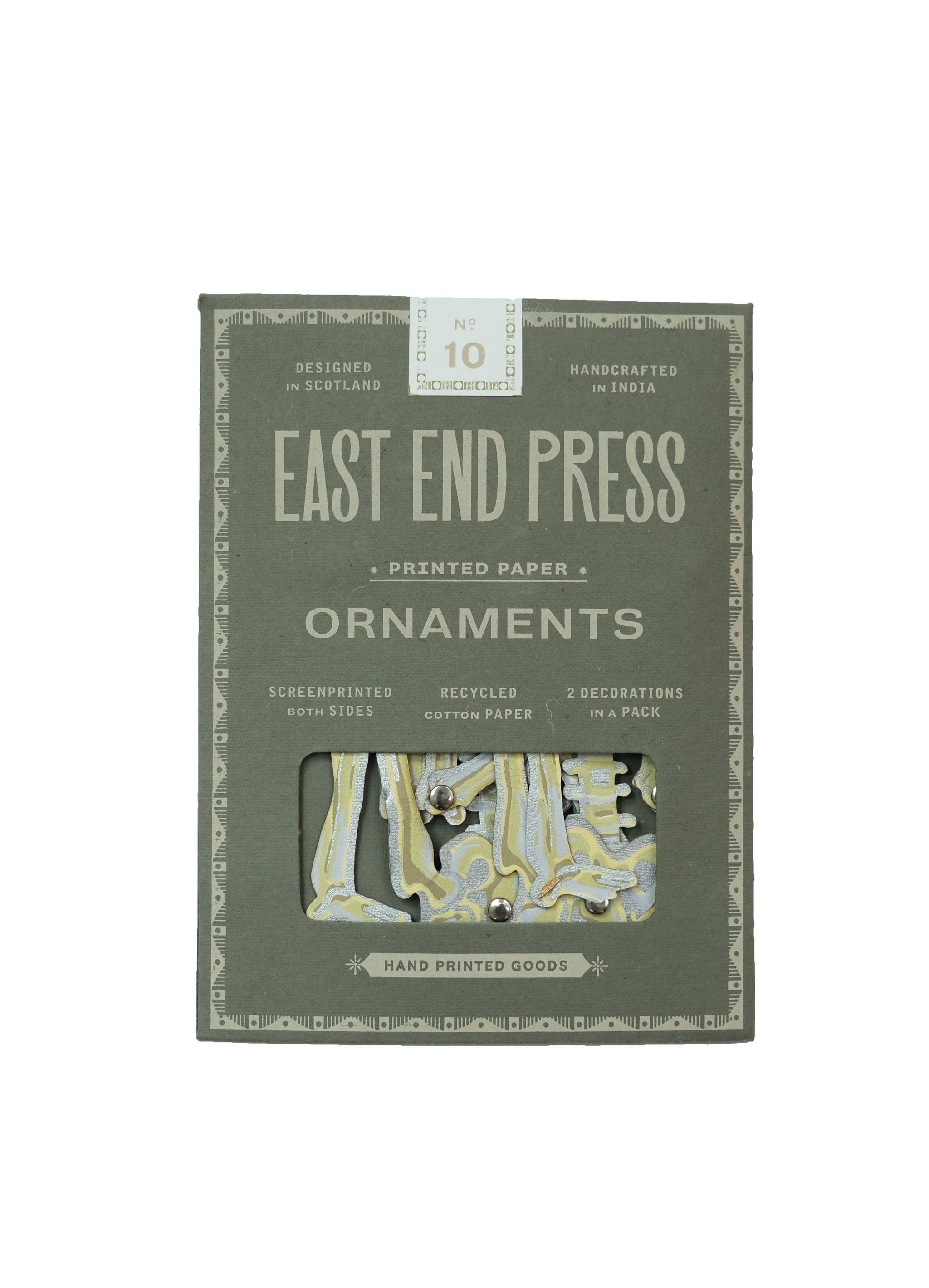 A set of 2 illustrated paper decorations with cotton 10cm hanging loop