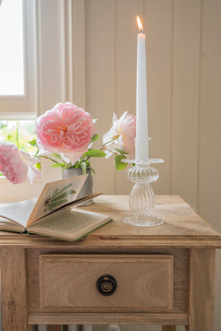 Glass candle stick with a fluted design. Hand blown to a mould from recycled glass blend.