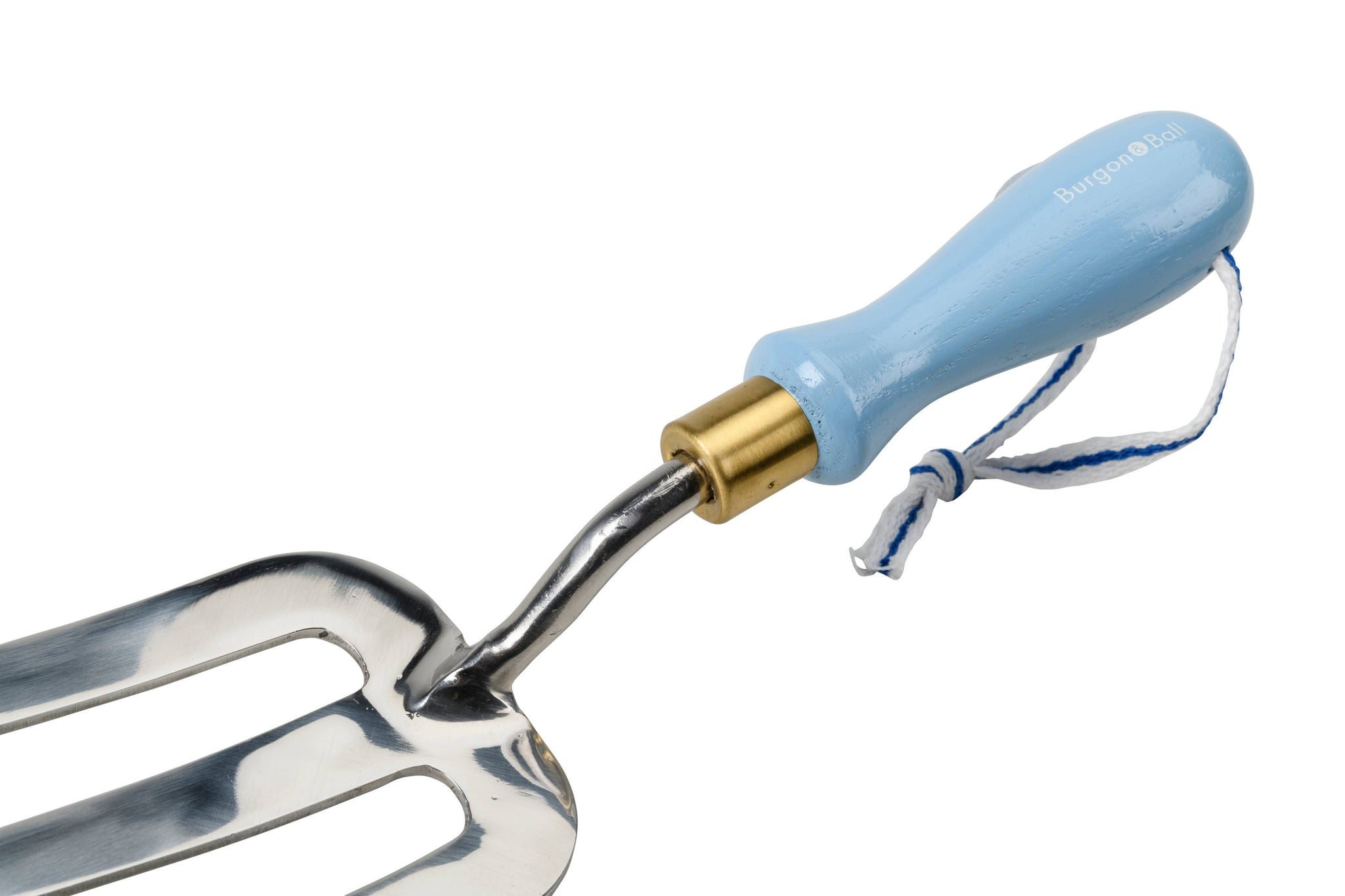 This hand fork has a painted wooden handle in a lovely shade of blue. The ferrule which connects head and handle is solid brass, bringing a beautiful warm highlight to the look. There’s a striped cotton hanging cord for easy storage.