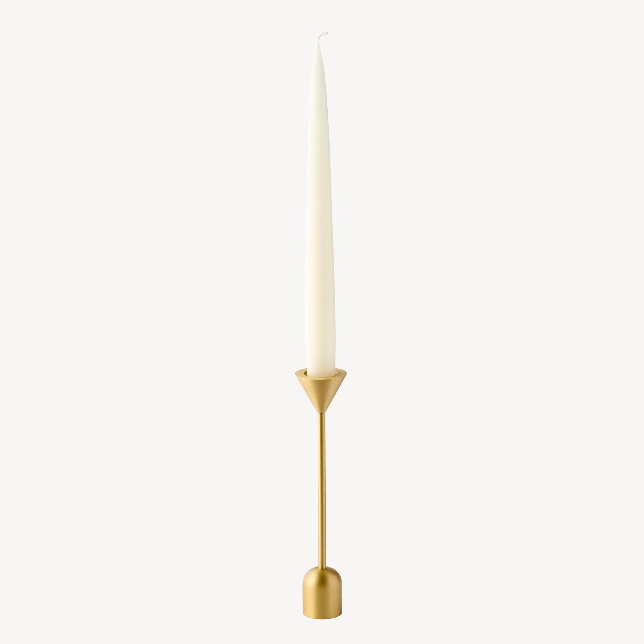 This sleek, satin solid brass reversible candle holder is a striking accessory for any tablescape or space.