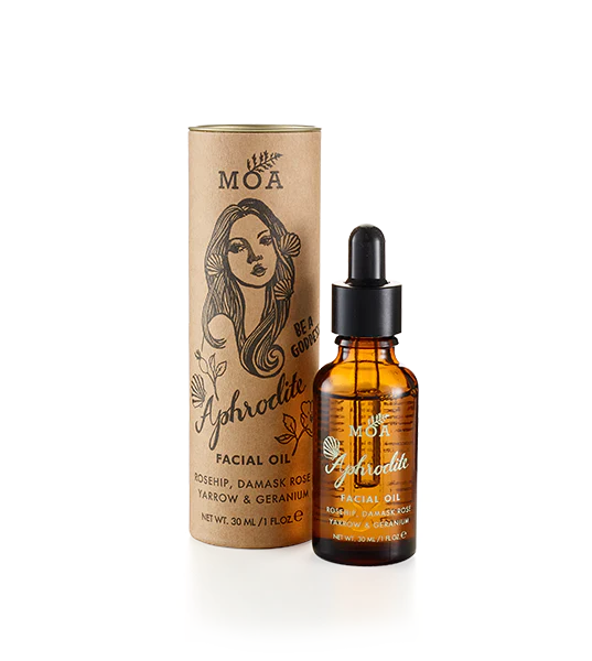 The Aphrodite Facial Oil is a calming blend for sensitive skin, by MOA. This easily absorbed organic facial oil helps to smooth fine lines and ward off premature ageing with its nourishing rosehip oil base. Rosehip seed oil is rich in vitamin A, C and essential fatty acids, its natural skin regenerative properties have been revered for millennia.