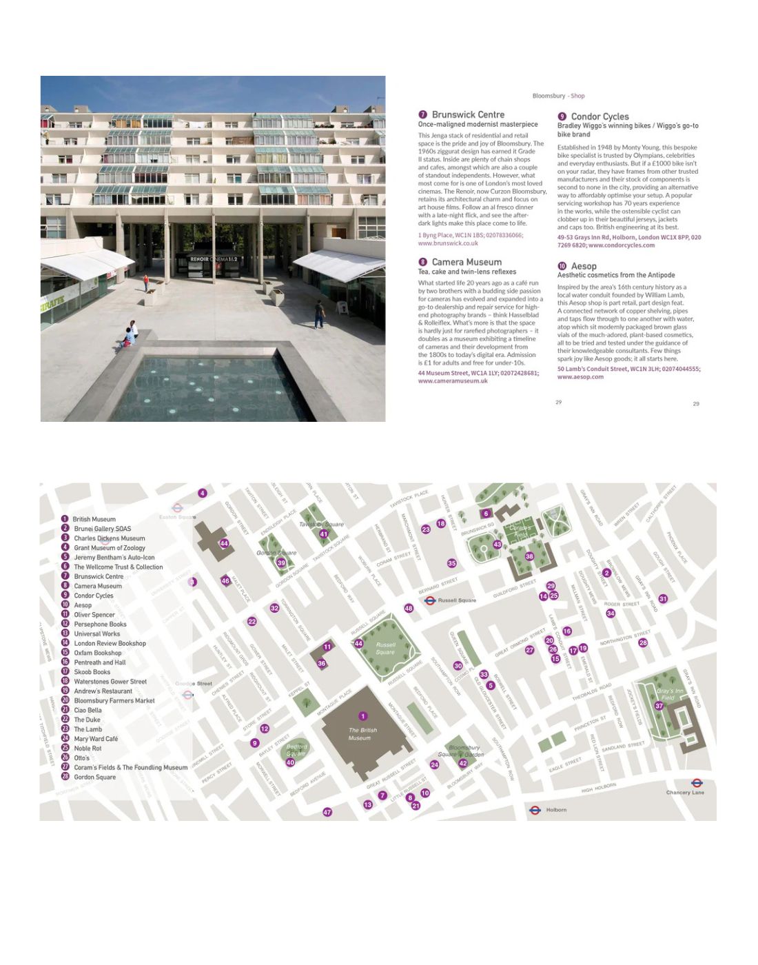 1 Bloomsbury 2. Soho 3. Barbican 4. Hampstead 5. Stoke Newington 6. Islington  7. Hackney 8 Shoreditch 9. Walthamstow 10. Borough & Bermondsey 11. Brixton 12. Greenwich 13. Notting Hill 14. Richmond 15. Hammersmith & Chiswick