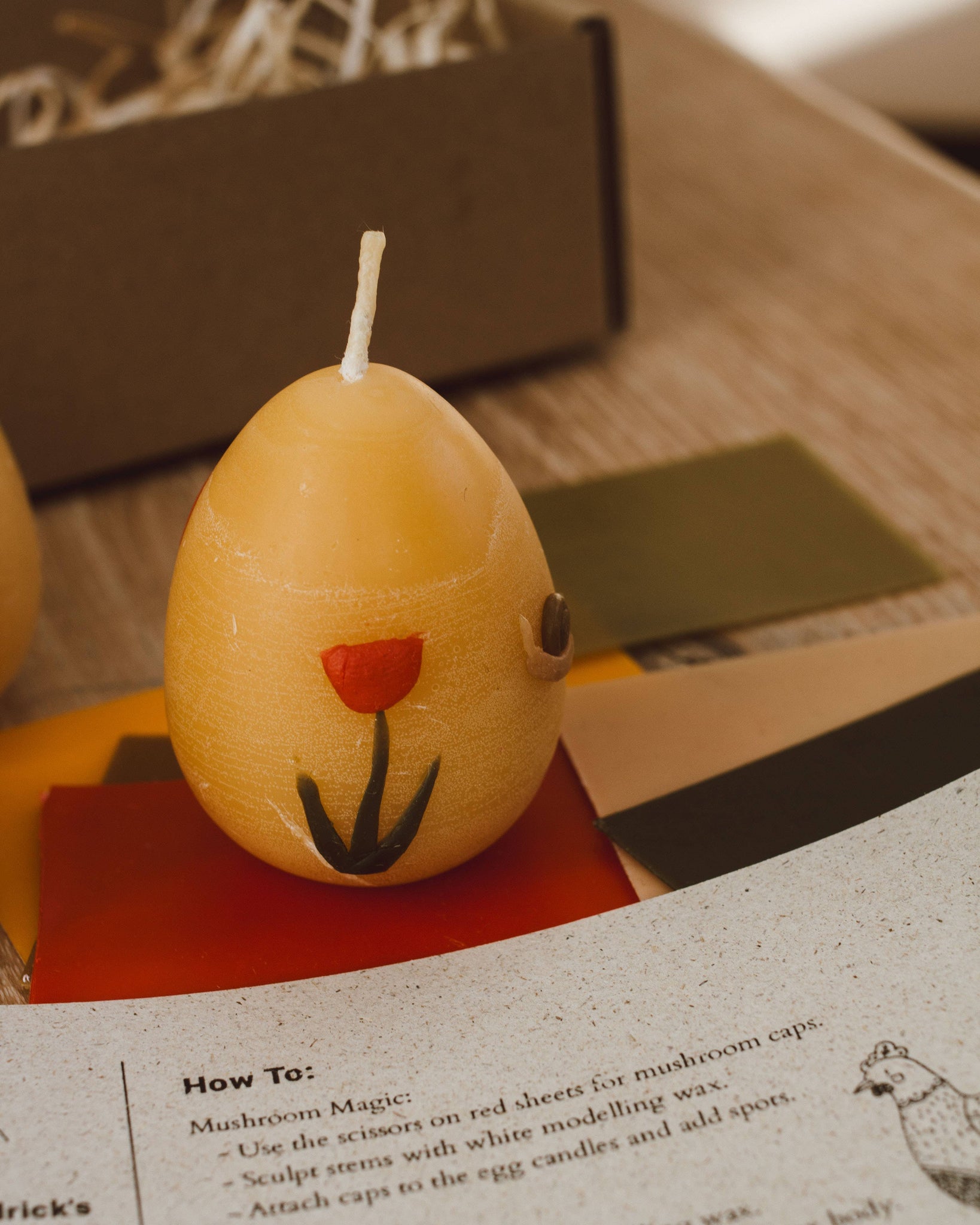 Step-by-Step Instructions: The Toadstool Design: 1. Use the scissors to circles circles from the red decorating wax sheets. 2. Gently divide each circle to create caps for your toadstools. 3. Sculpt stems using white modelling wax. 4. Place the toadstool caps on your egg candles and press gently to secure. 5. Add small pieces of white modelling wax to the caps for additional detailing. Experience the creativity with Goldrick's Beeswax Egg Candle Decorating Kit, where each candle tells its own story in the warm glow of beeswax brilliance.