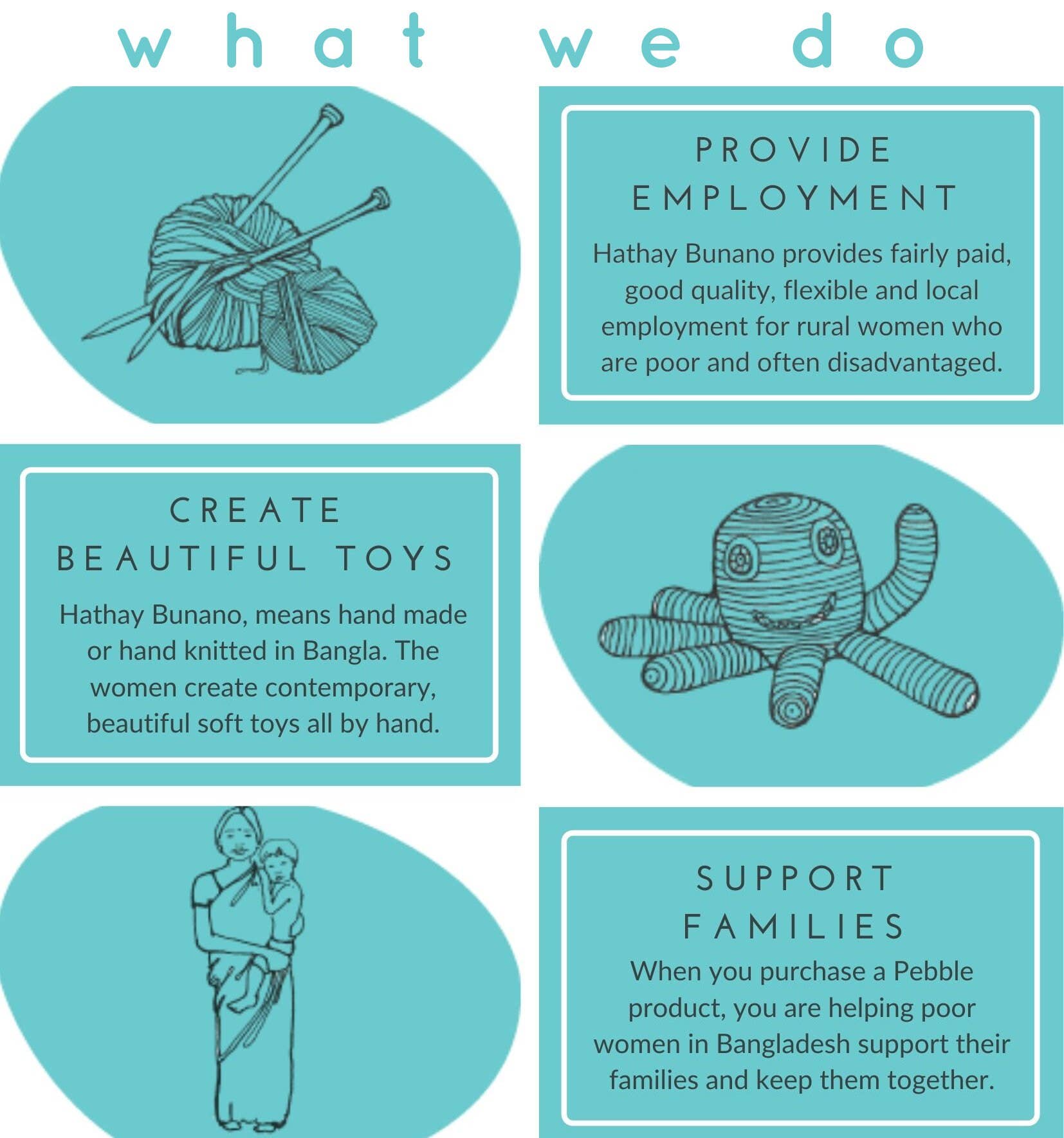 All Pebble products are made by HathayBunano. HathayBunano, meaning handmade or hand knitted in Bangla, is a non-profit fair trade organization in Bangladesh. Its mission is to create fairly paid, good quality, flexible and local employment for rural women who are poor and often disadvantaged.