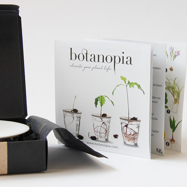 This Botanopia original product is made of porcelain to make it highly durable and easily reusable. Dishwasher proof, easy to clean and handmade in a small ceramics studio in the Czech Republic. Presented in a beautiful black gift box, detailed instructions for germination and propagation are included to get you started right away.