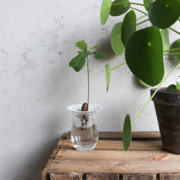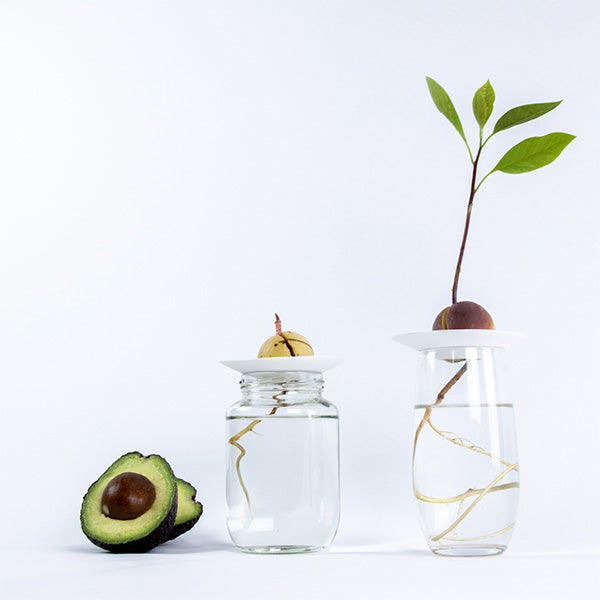 Simply place the elegant porcelain propagation cone on any glass or jar and place your pit or bulb on top. The plate will keep it comfortably hovering above the water while the roots make their way down for growth.