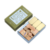 13 beech wood and rubber stamps with a tin ink holder, stored in a paper sleeve