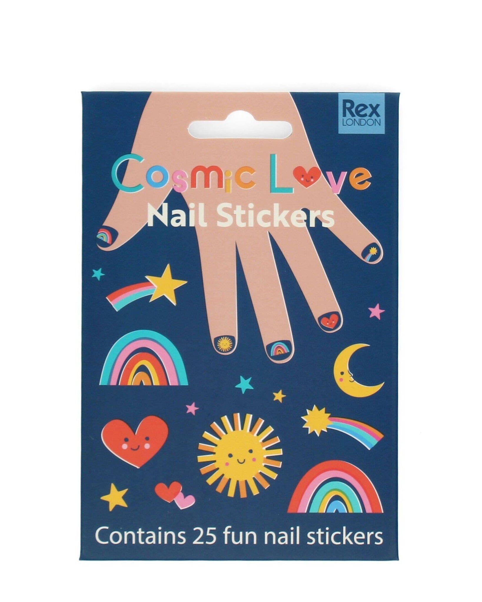 A pack of 25 nail stickers, each featuring an image such as a heart, star, rainbow, moon, etc. from our Cosmic Love print.