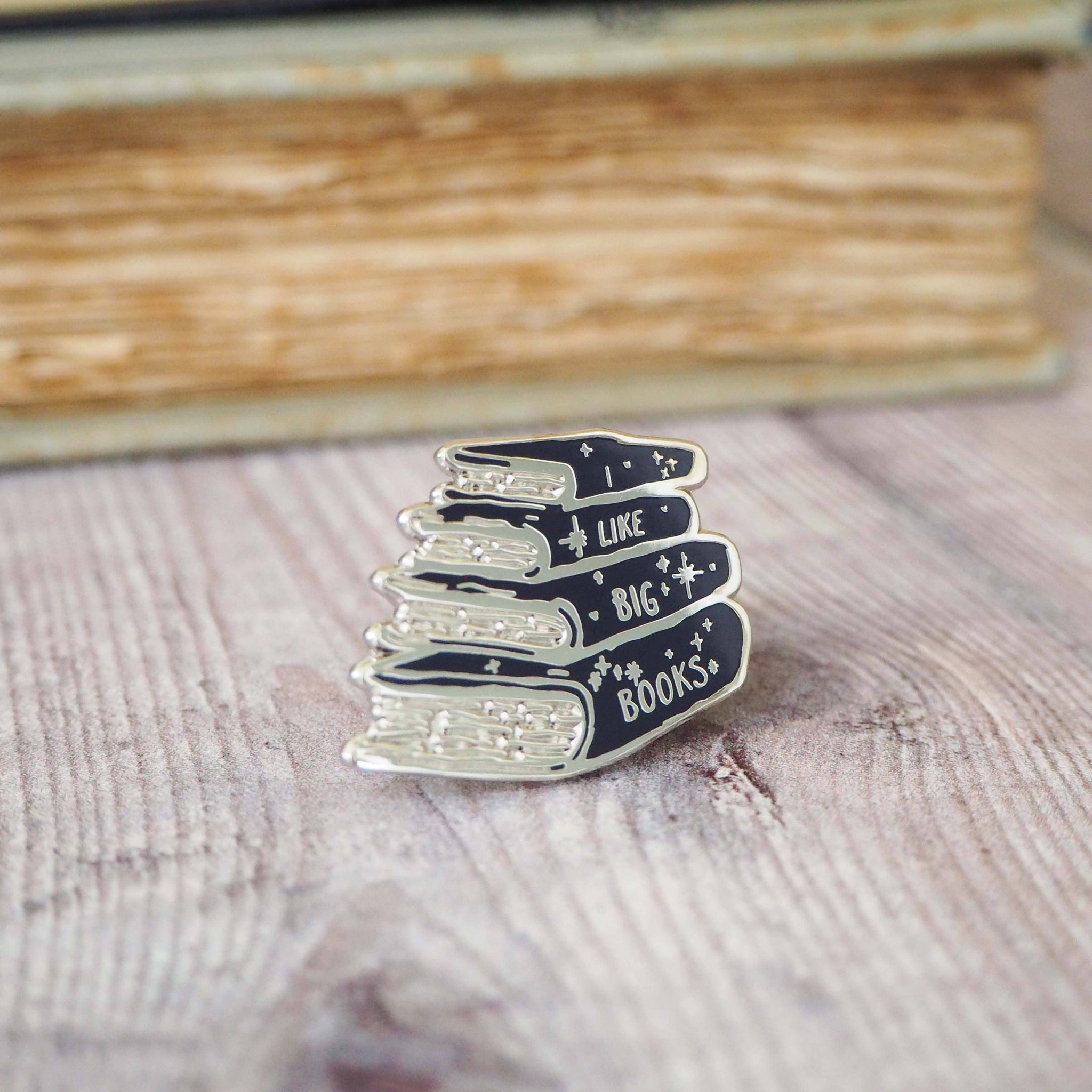 A shiny silver and blue enamel pin badge featuring an 'I like big books' book stack design.