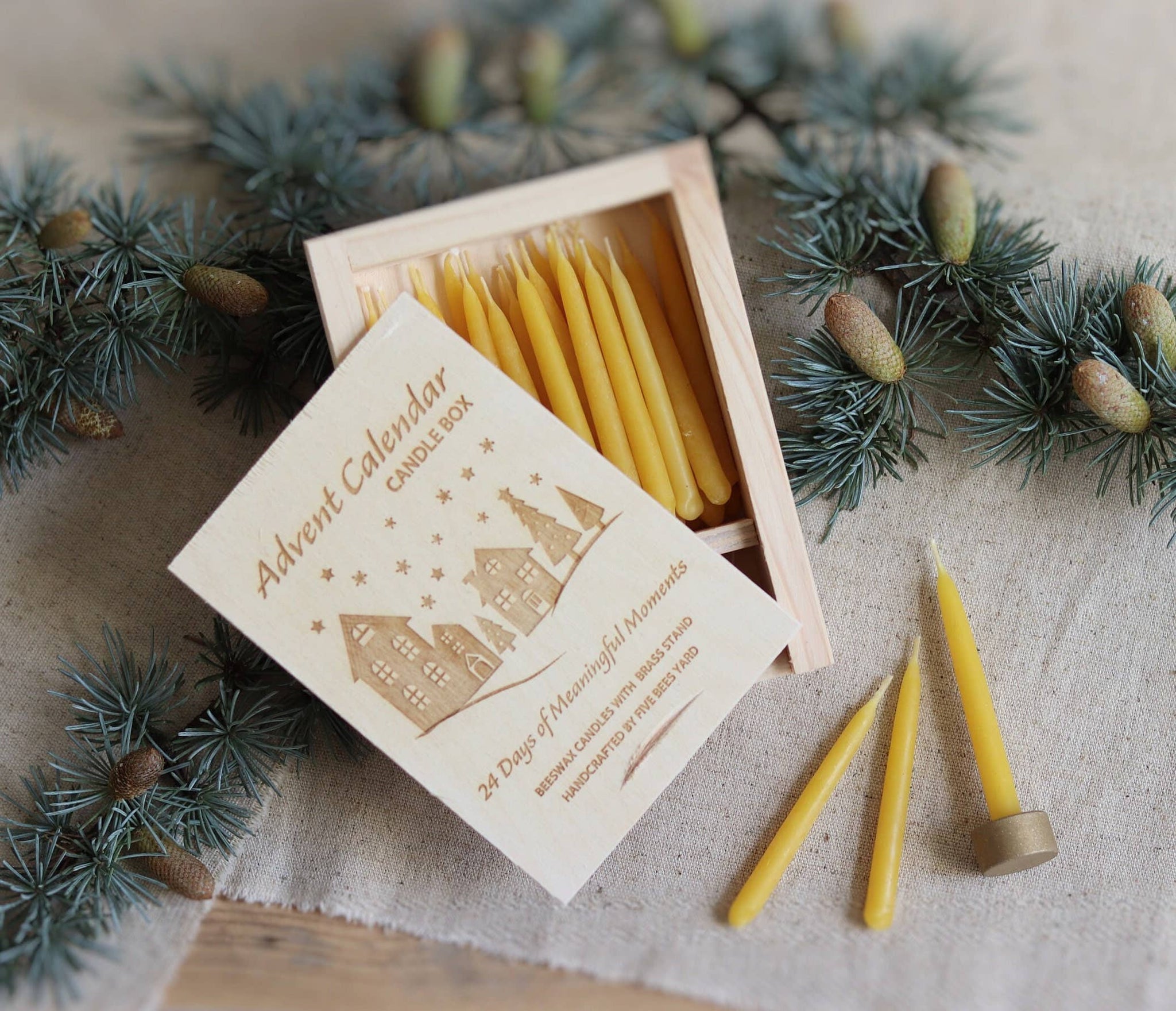 Advent Calendar Candle Box is made from sustainable wood. It’s refillable and reusable with a distinctive engraving on a lid. Candles are handmade by us using raw beeswax. Stand is handmade for us from brass.