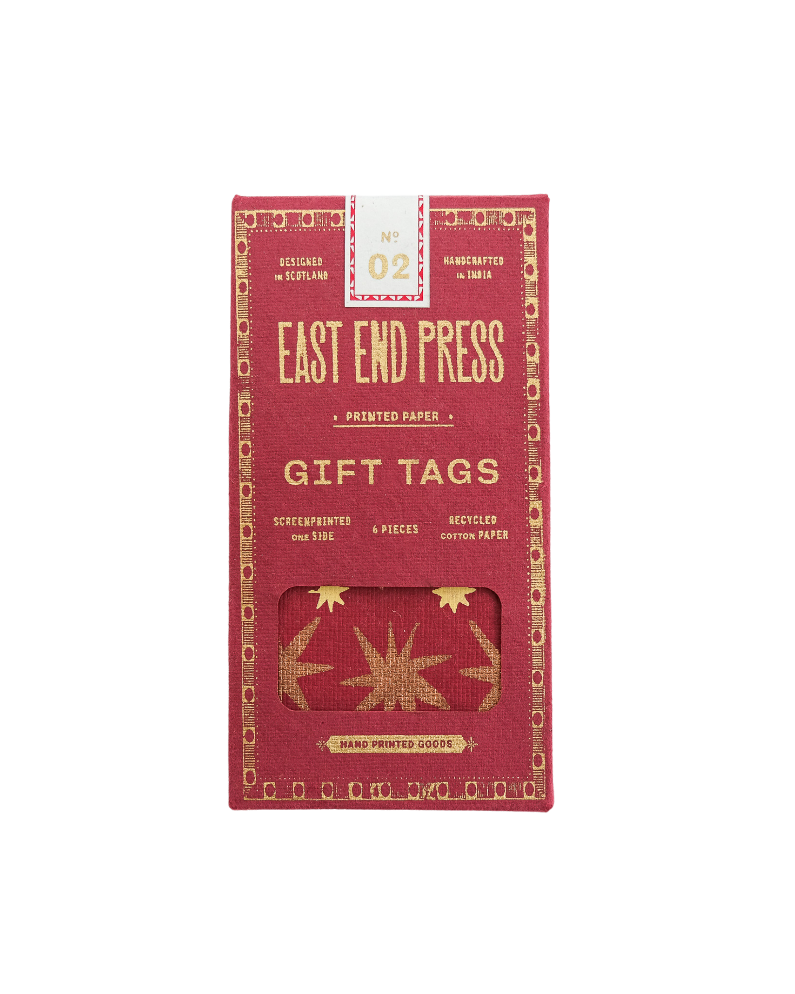 A set of six screen-printed gift tags in assorted Christmas colours and patterns.