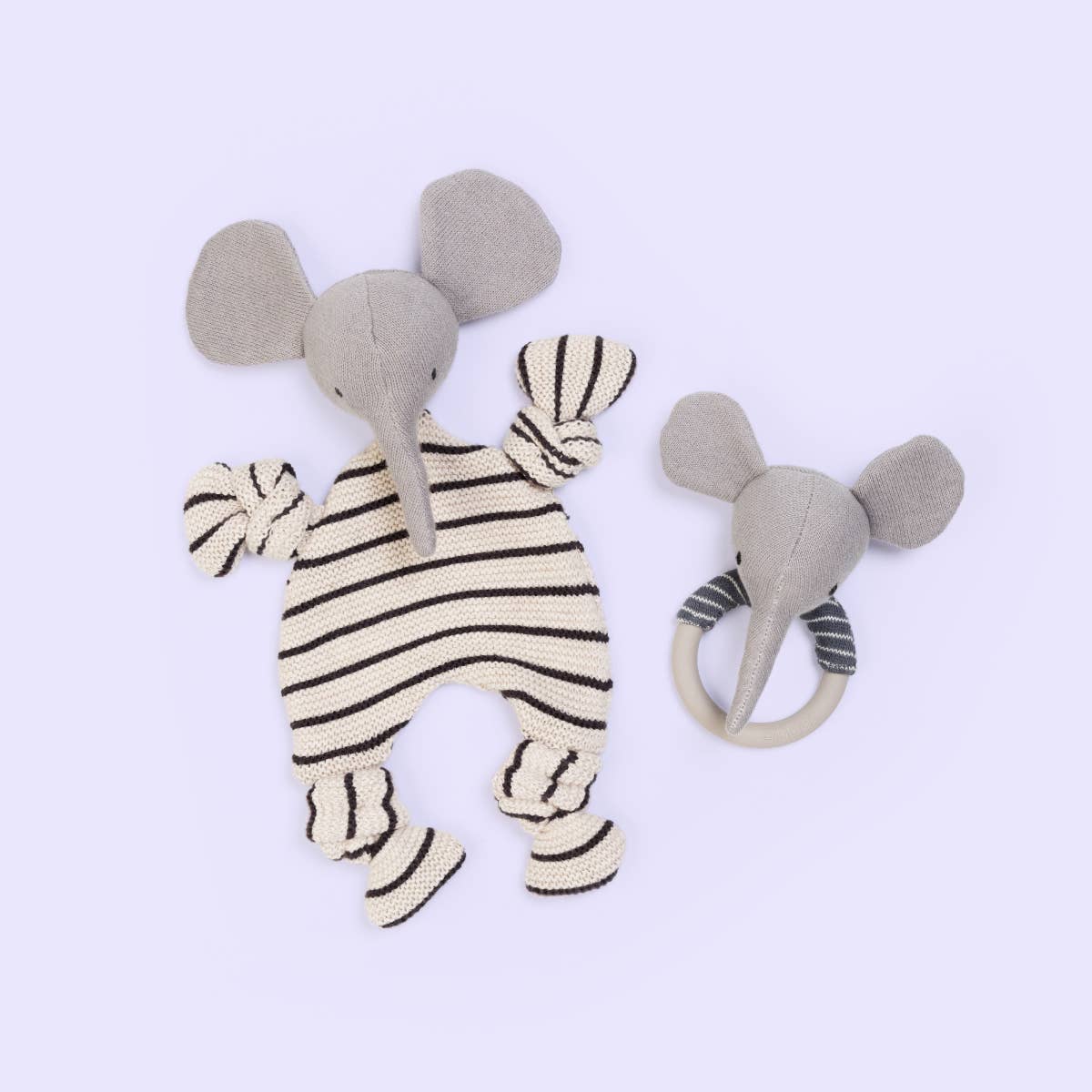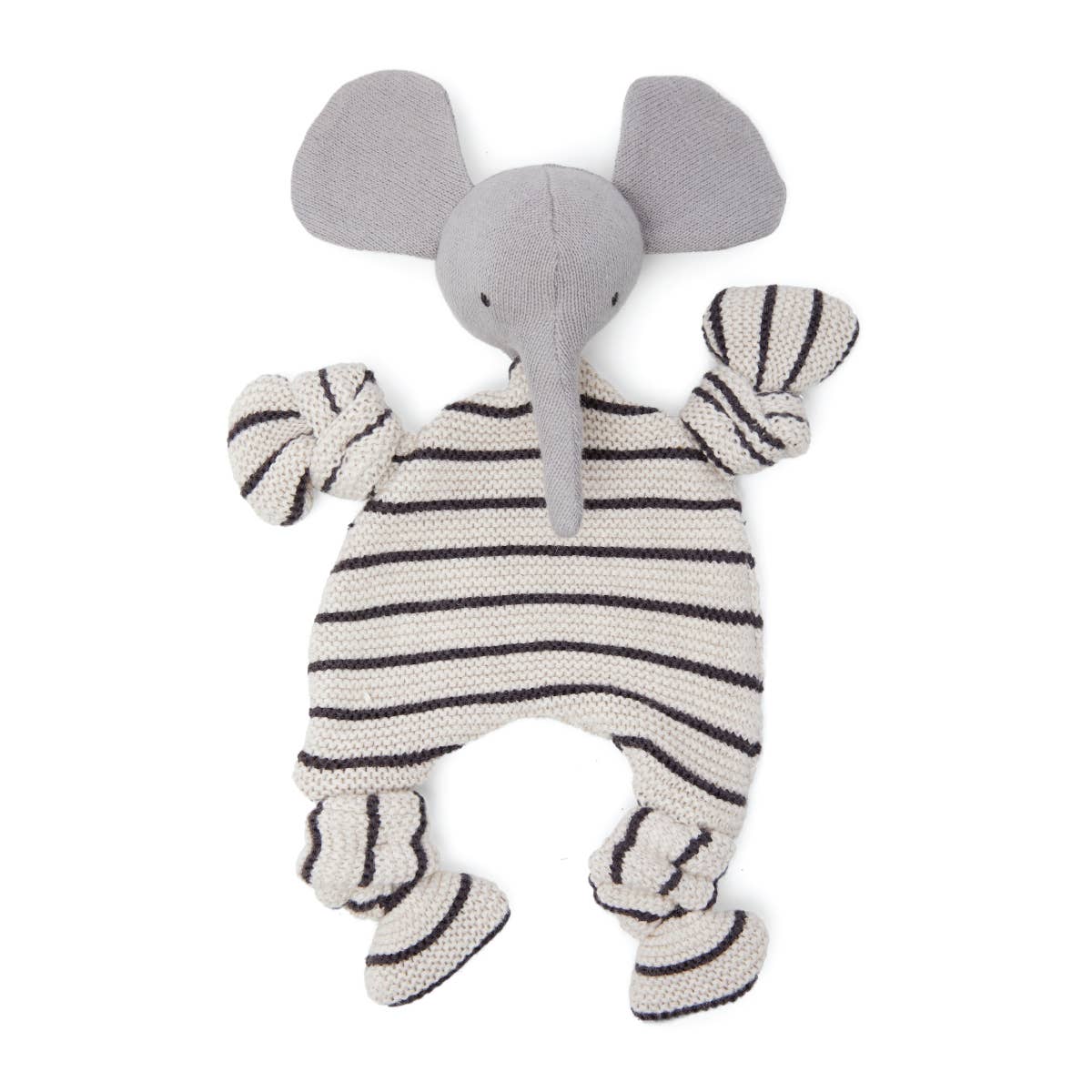 Our cotton knit comforters make the perfect newborn gift. Their soft, floppy bodies make them very tactile - ideal for first snuggles as babies start to reach out for comfort themselves. They are the ultimate reassuring security blanket. Babies love our elephant's bendy trunk and large ears - perfect for twiddling!