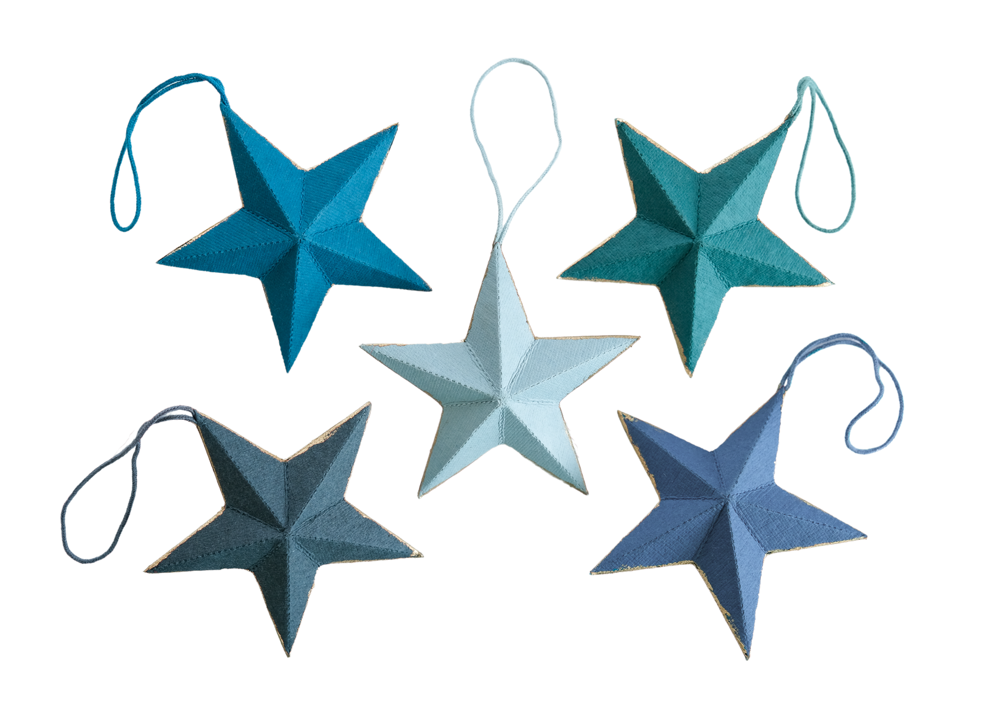 Five printed board ornaments with gold edges, sustainably made from 100% recycled paper.