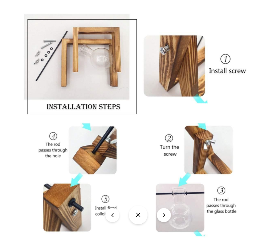 The glass planter's frame is made of natural wood, and the 3x glass bulb terrariums are made of heat-resistant glass.