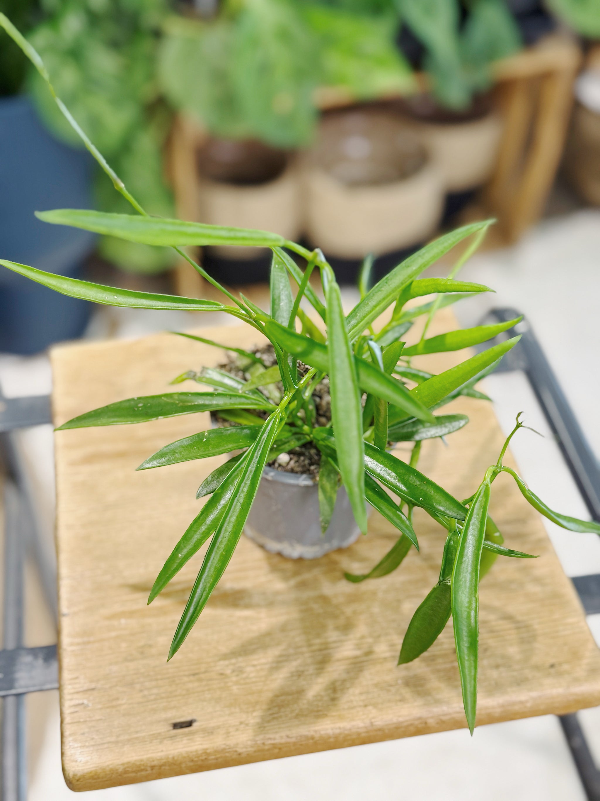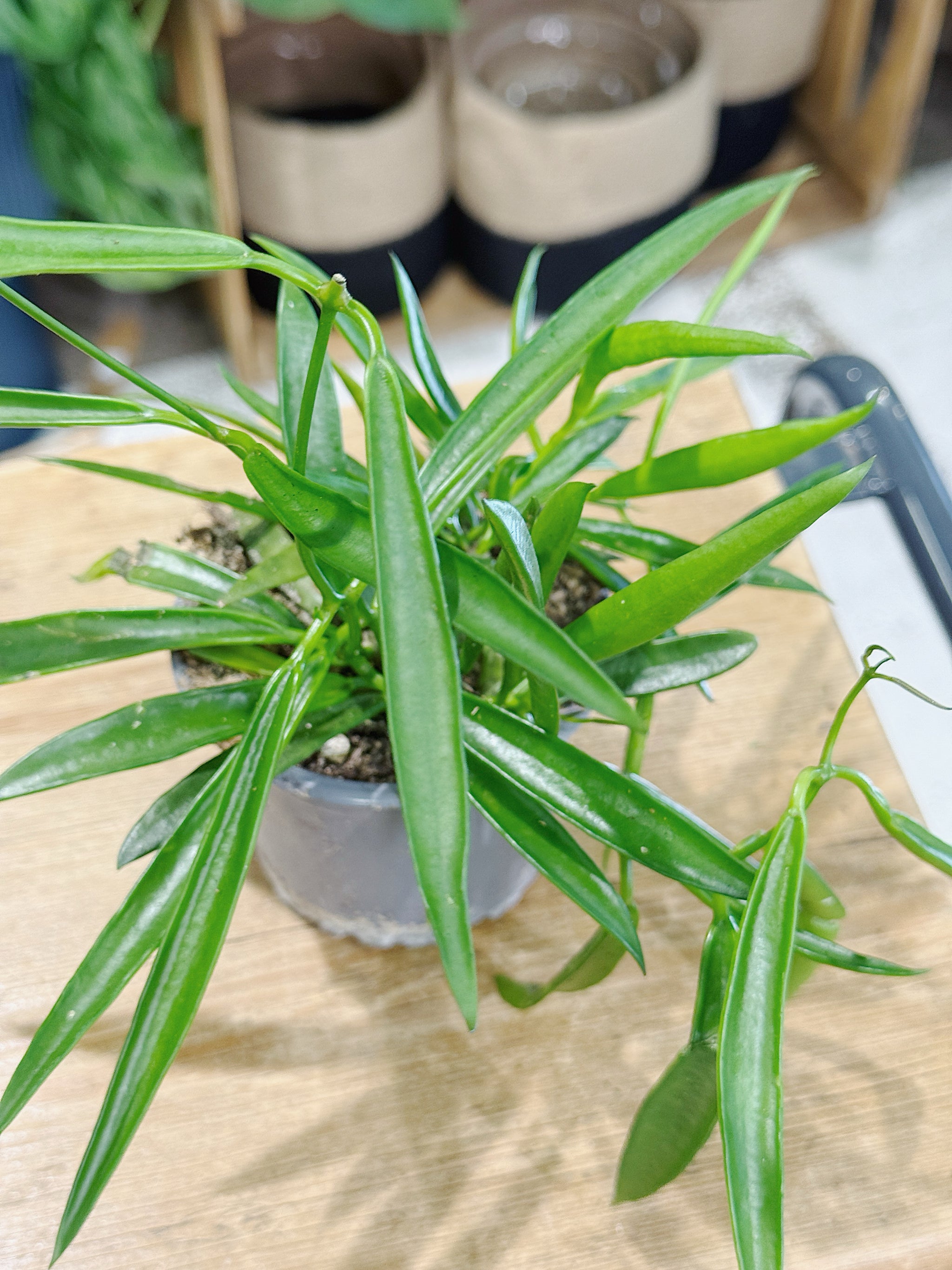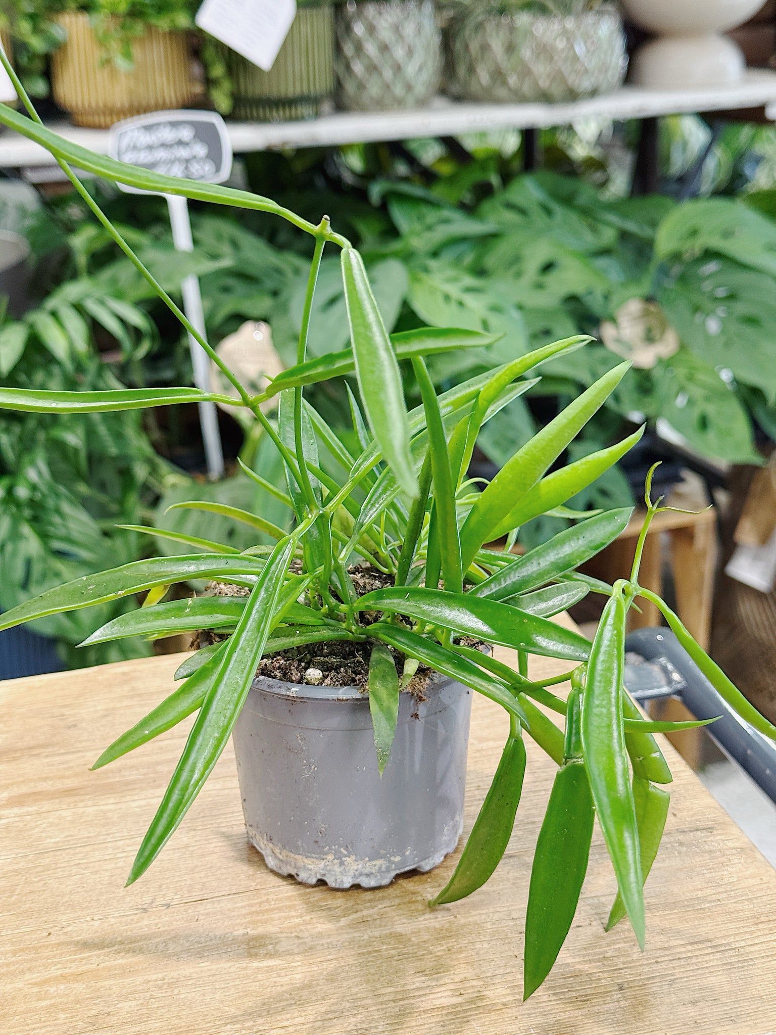 Hoya Carnosa Longifolia has long stems with slender, green-bean-shaped leaves. Produces clusters of sweet-smelling, star-shaped flowers in white or pink at the end of summer.