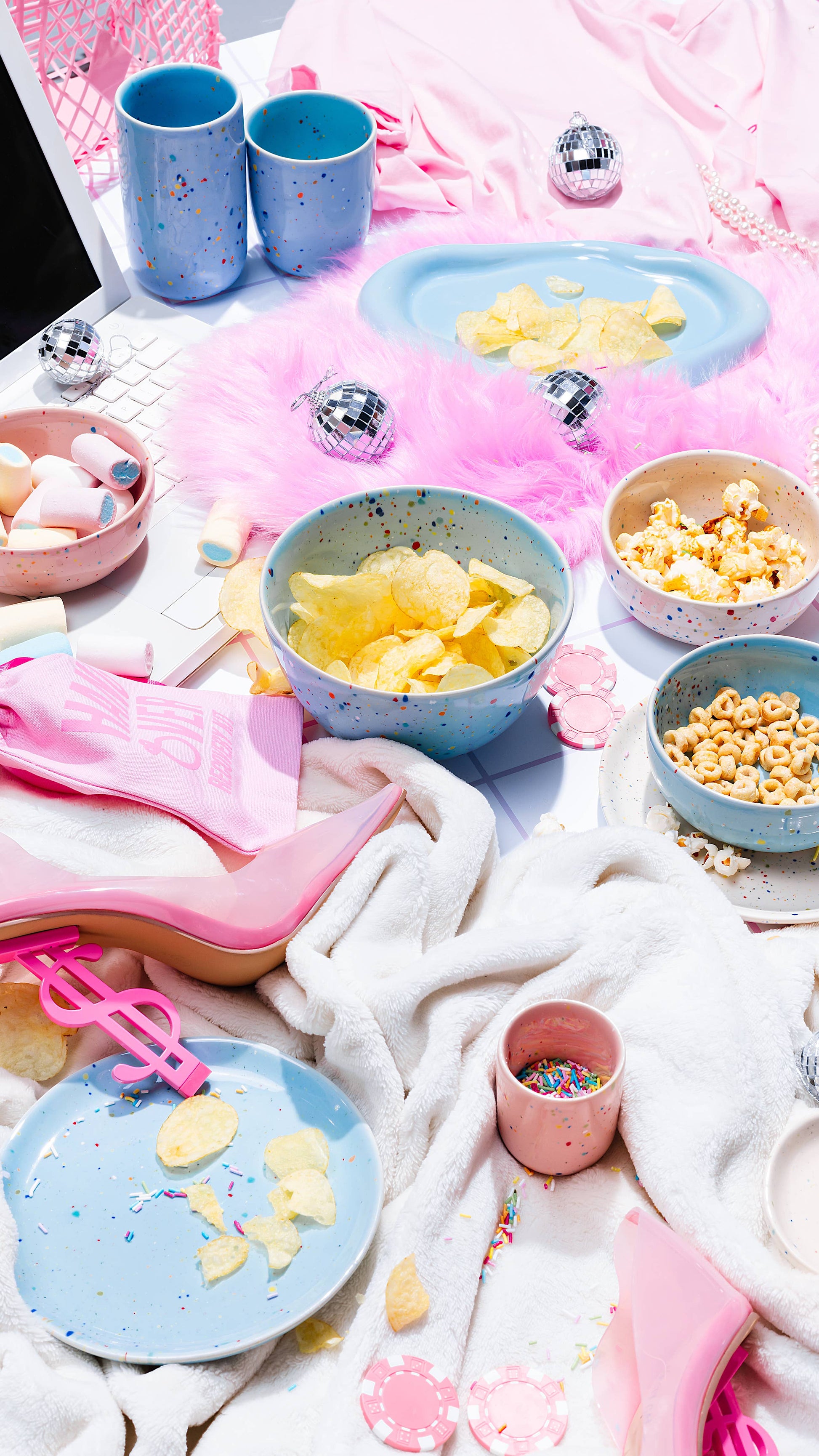 Our Party Collection features a special type of glaze that may exhibit areas where speckles become diffused due to the glass's reactive nature during processing. We find these unique, unpredictable variations to be the most beautiful aspect of the glaze.