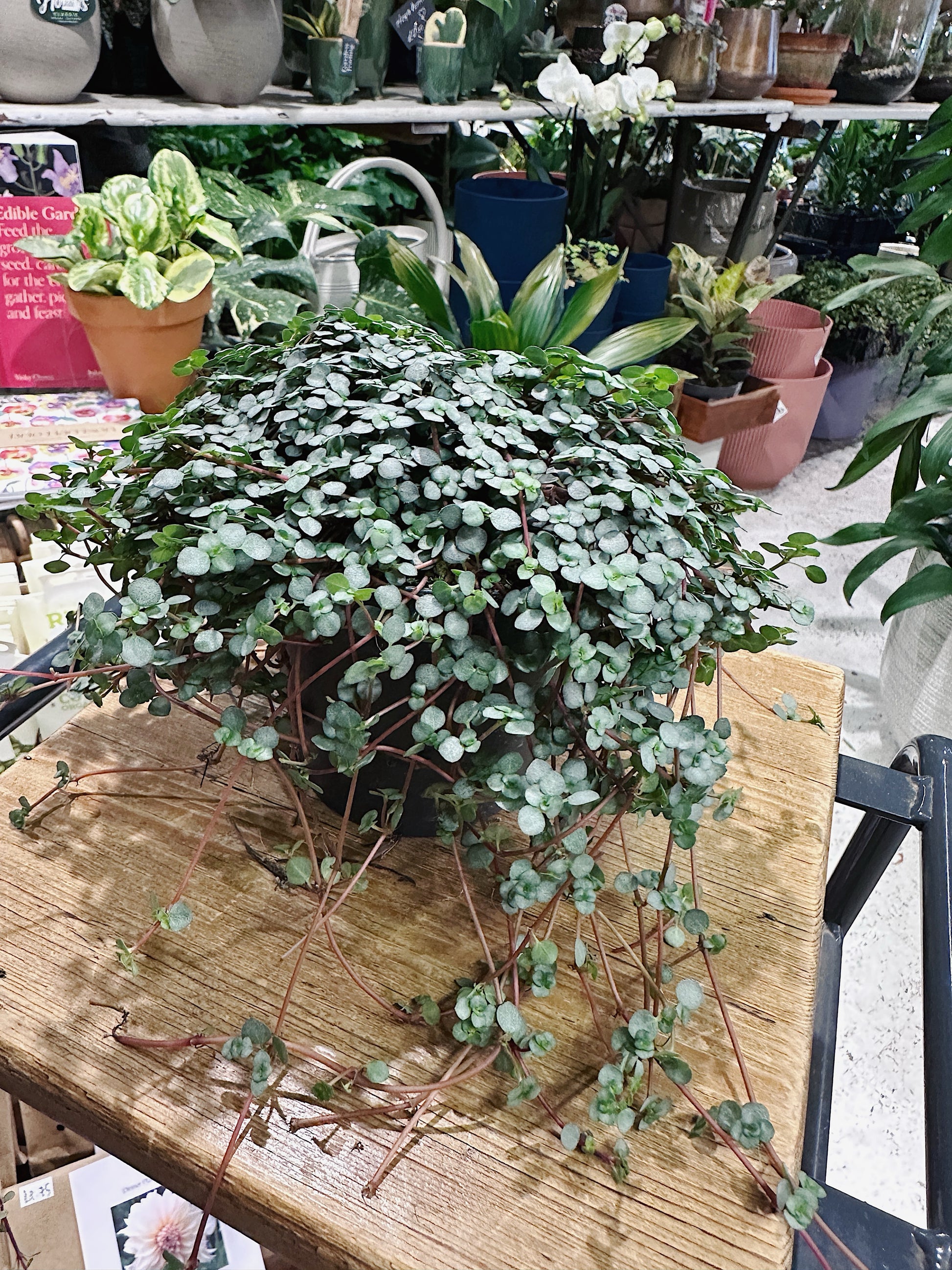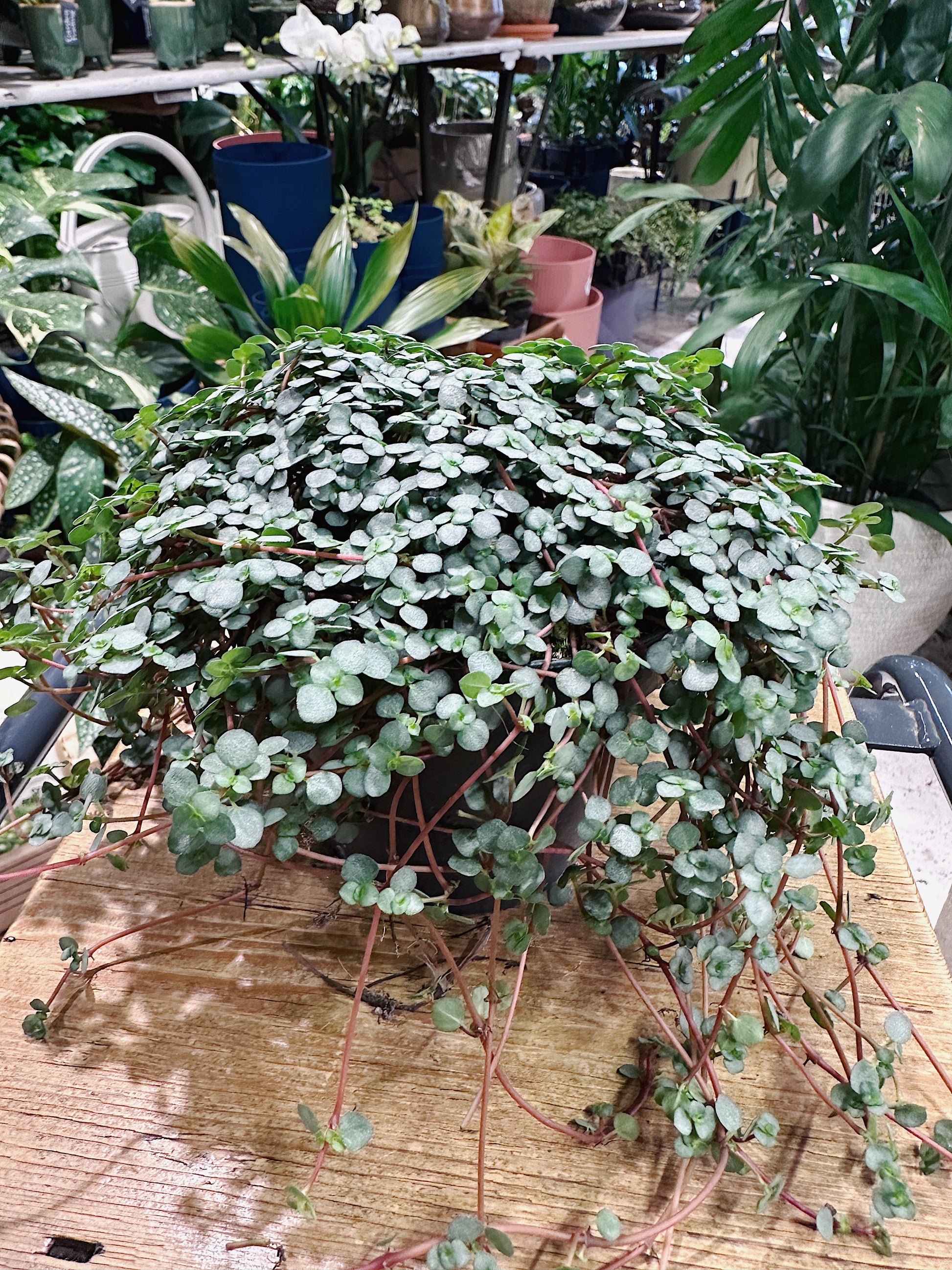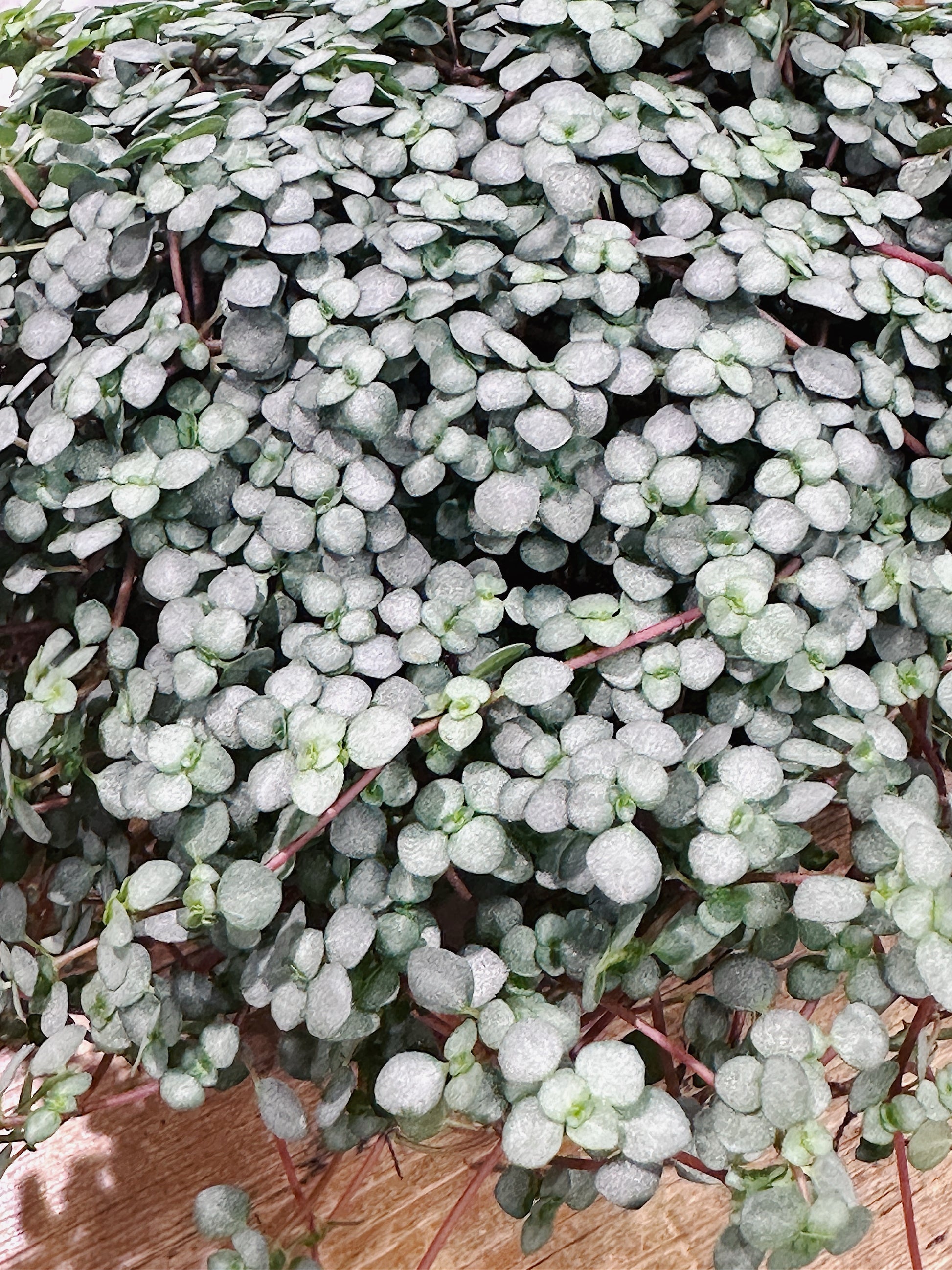 The cascading grey leaves of Pilea glaucophylla greyzy are small and circular and boast a stunning silver-green colour with a slightly rippled texture.
